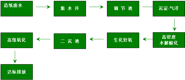 針對廢水中的微溶性有機物、難降解有機物分別采用不同的工藝單元處理,具有效率高,投資省,運行成本低、占地小等特點,適于處理噸紙排水量較低的高濃度造紙廢水。